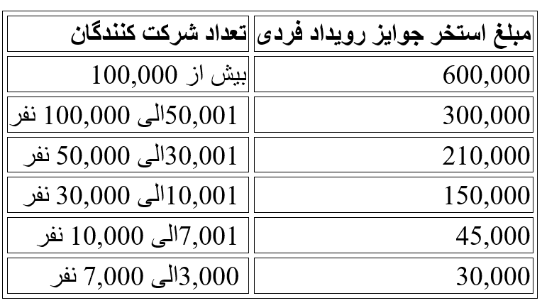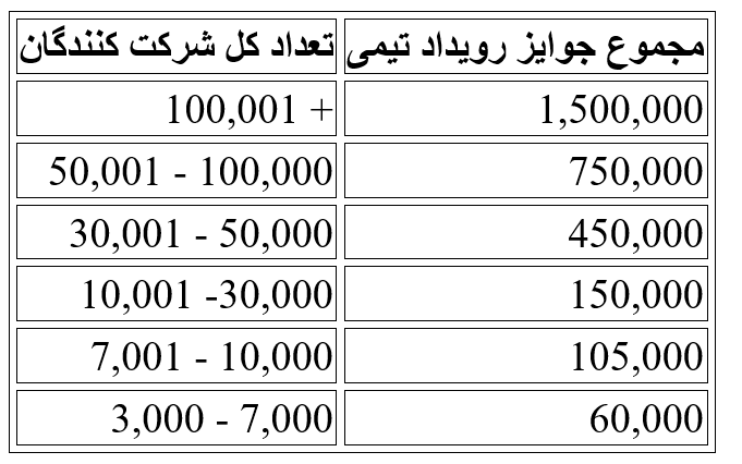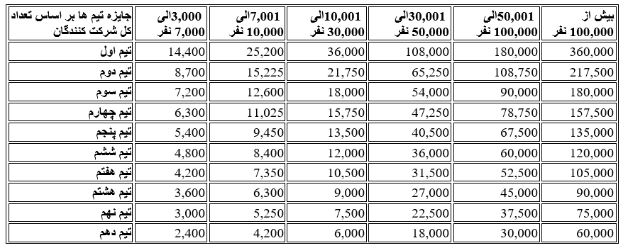 - اگر تعداد شرکت کنندگان ۷۰۰۱ الی ۱۰,۰۰۰ نفر باشند ۲۰ نفر برتر واجد شریاط دریافت جایزه خواهند بود.