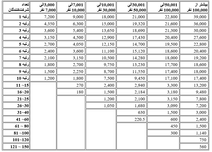 - اگر تعداد شرکت کنندگان ۳۰,۰۰۱ الی ۵۰,۰۰۰ نفر باشند ۶۰ نفر برتر واجد شریاط دریافت جایزه خواهند بود.