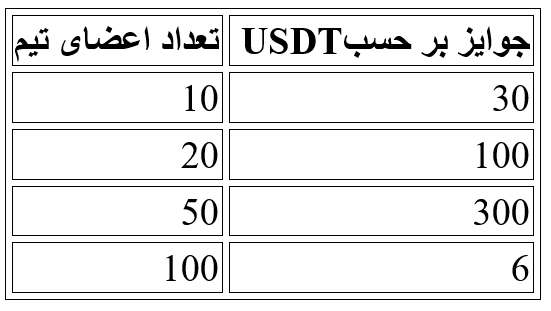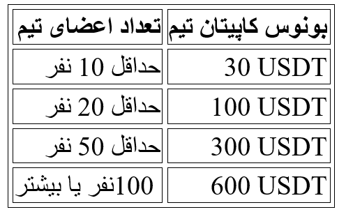 برای کاپیتان ها در نظر گرفته شده است. هرچه تعداد اعضای معتبر جذب شده توسط شما بیشتر باشد، میزان جایزه دریافتی بالاتر خواهد بود. چنانچه حجم معاملات فیوچرز هر یک از اعضای تیم به حداقل ۳۰,۰۰۰ USDT یا بیشتر برسد و تعداد این اعضا به حد نصابهای تعیین شده در جدول زیر دست یابد، کاپیتان تیم مستحق دریافت جوایز مربوطه خواهد بود. کل استخر جوایز این طرح، ۵۰,۰۰۰ USDT در قالب سرمایه اعتباری بر اساس اولویت ورود میباشد.